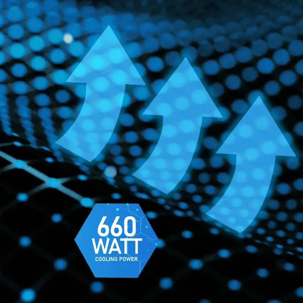 Due to the normal heat development of our body, the water molecules bound on the fibers of the 3D-COOL material COOLINE SX3 evaporate so effectively that a pleasant temperature of 16 – 20°C with a cooling capacity of up to 660 Watt/l is thus established.